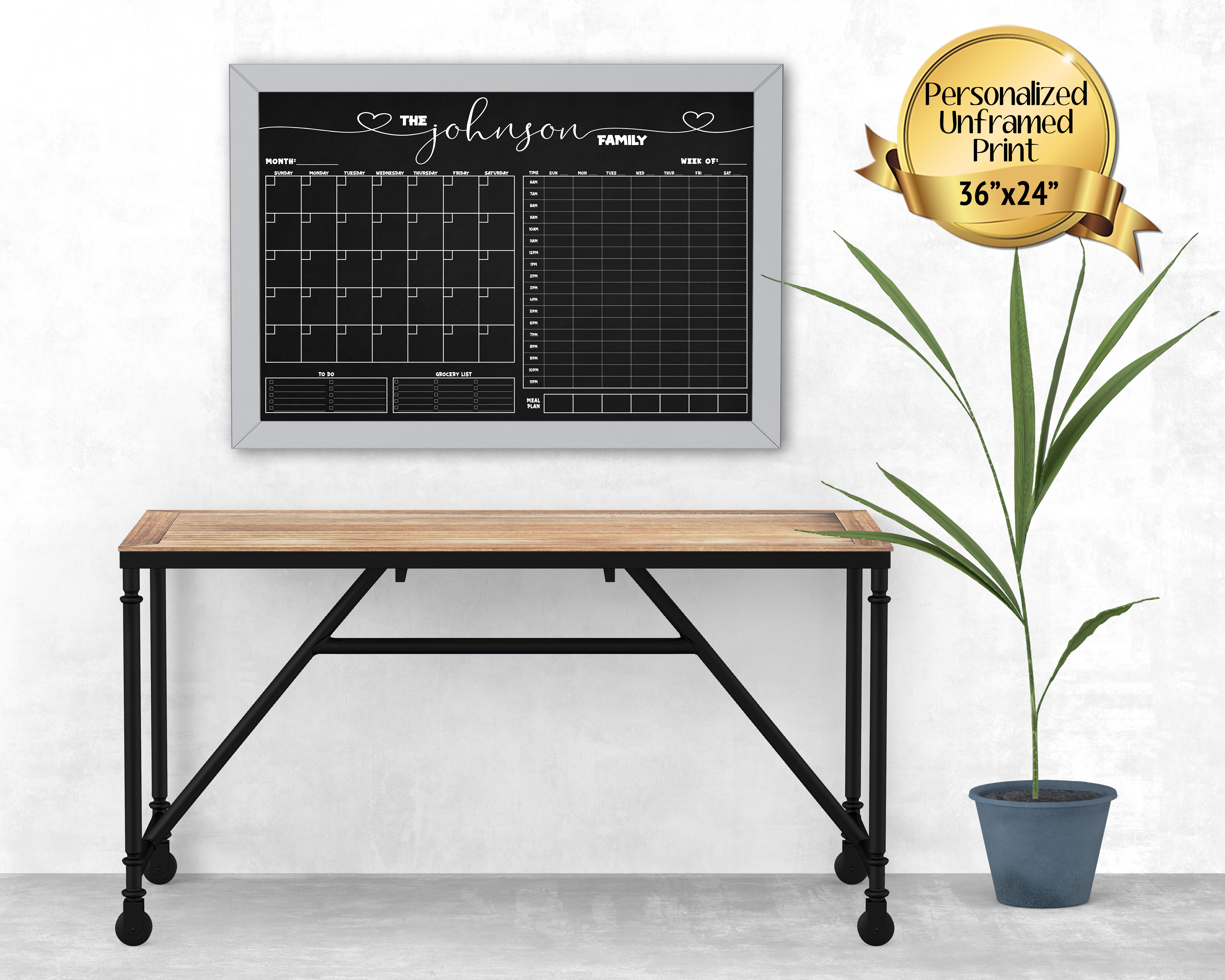 This listing is for a personalized 36″x24″ wall calendar print (no frame included!). This monthly calendar features a weekly meal planner, a grocery list, a to do list, and an hourly planner. This extra large calendar is perfect for your command center. Please ensure that it will fit within your space (including a few inches for the frame!). If you need a smaller size, I also have many 24″x18″ designs as well!