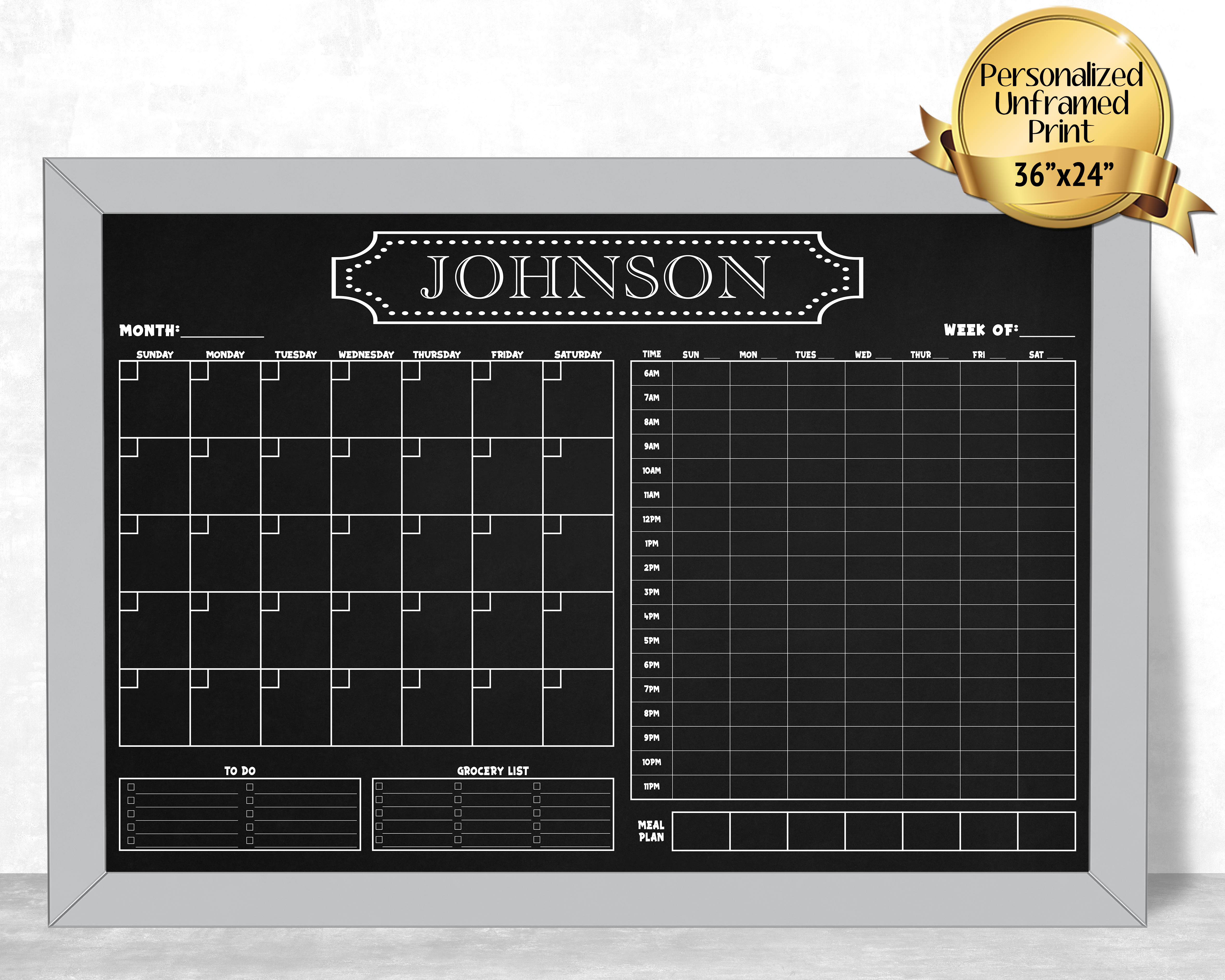 This listing is for a personalized 36″x24″ wall calendar print (no frame included!). This monthly calendar features a weekly meal planner, a grocery list, a to do list, and an hourly planner. This extra large calendar is perfect for your command center. Please ensure that it will fit within your space (including a few inches for the frame!). If you need a smaller size, I also have many 24″x18″ designs as well!