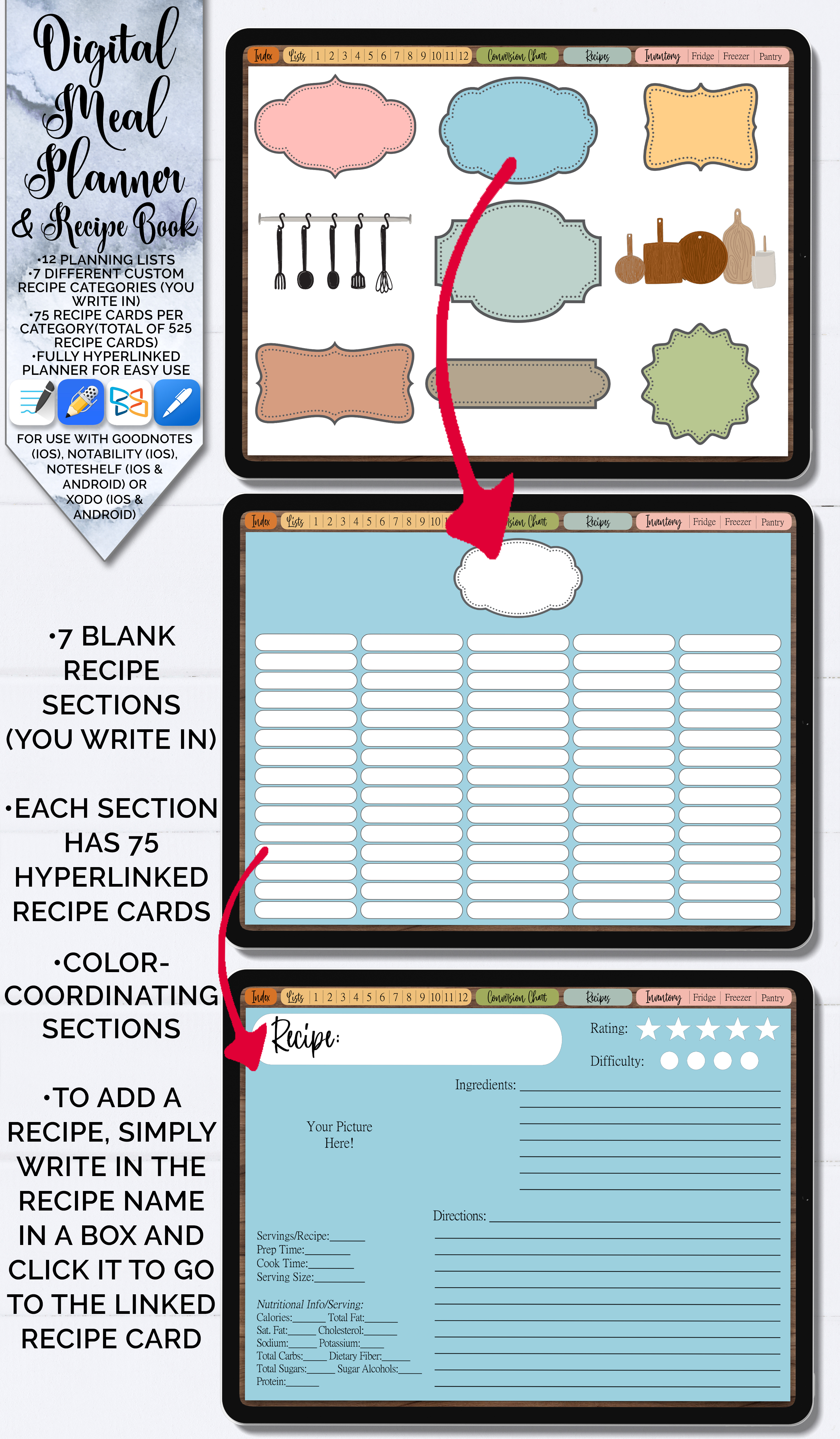 The recipe section has seven blank categories that you fill out to fit your own needs. Each category features 75 recipe cards that are all hyperlinked to quickly access each one. No need to flip and find pages anymore! That’s a total of 525 recipe cards in this planner!