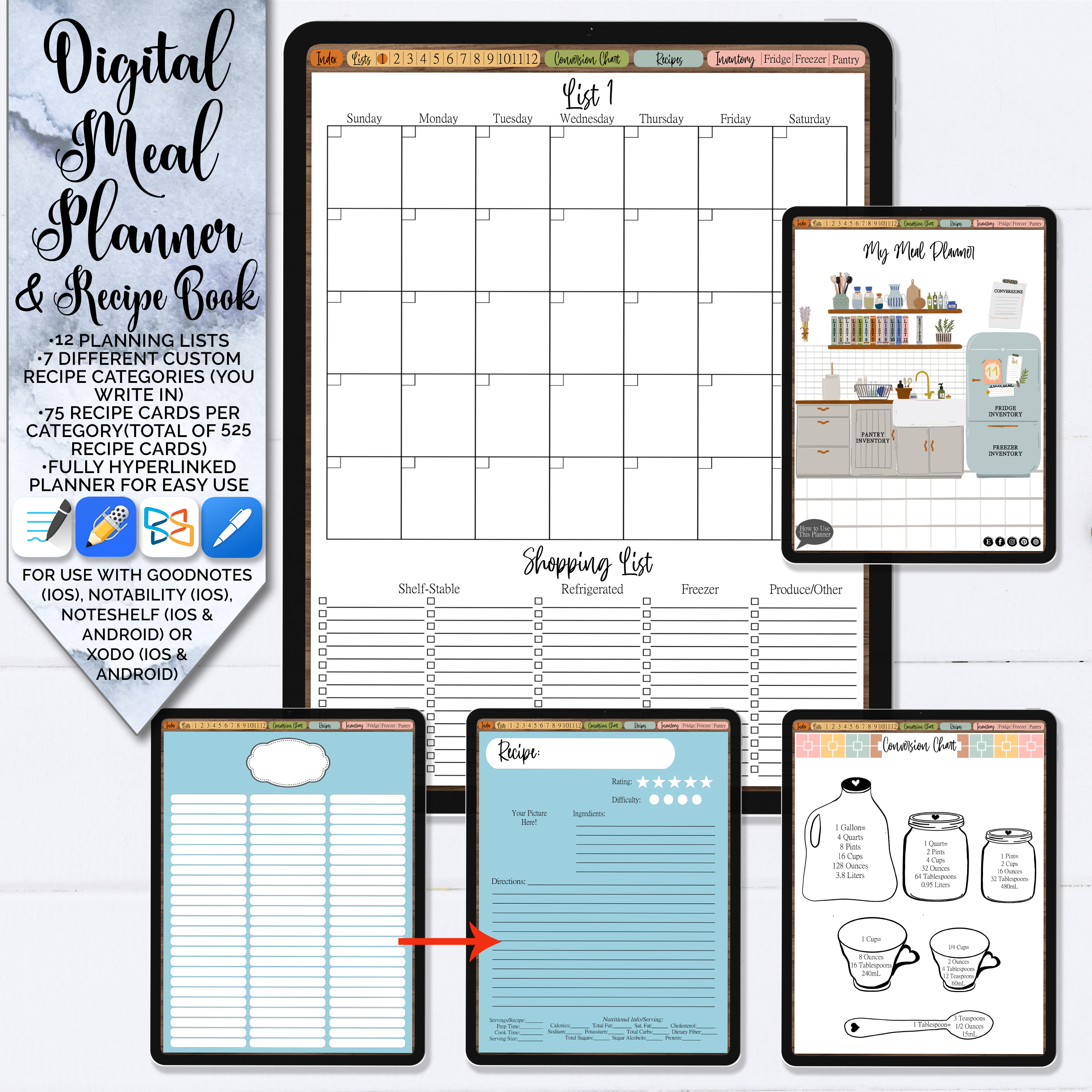 Up for sale is a fully hyperlinked 551 page digital meal planner & recipe book. It features 12 planning lists that you can use again and again to make meal planning a breeze after the initial lists are made. It also includes inventory lists and a recipe section.