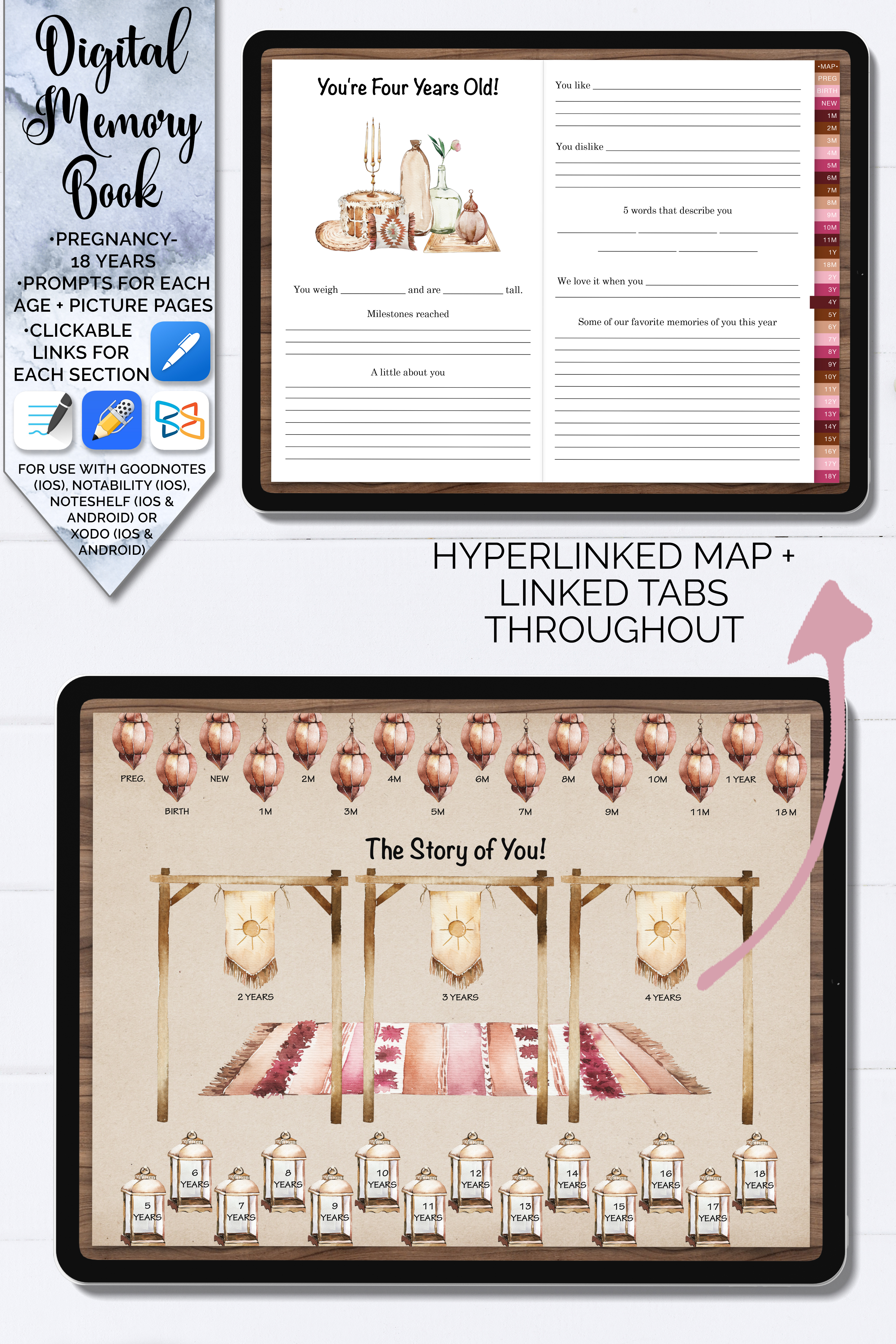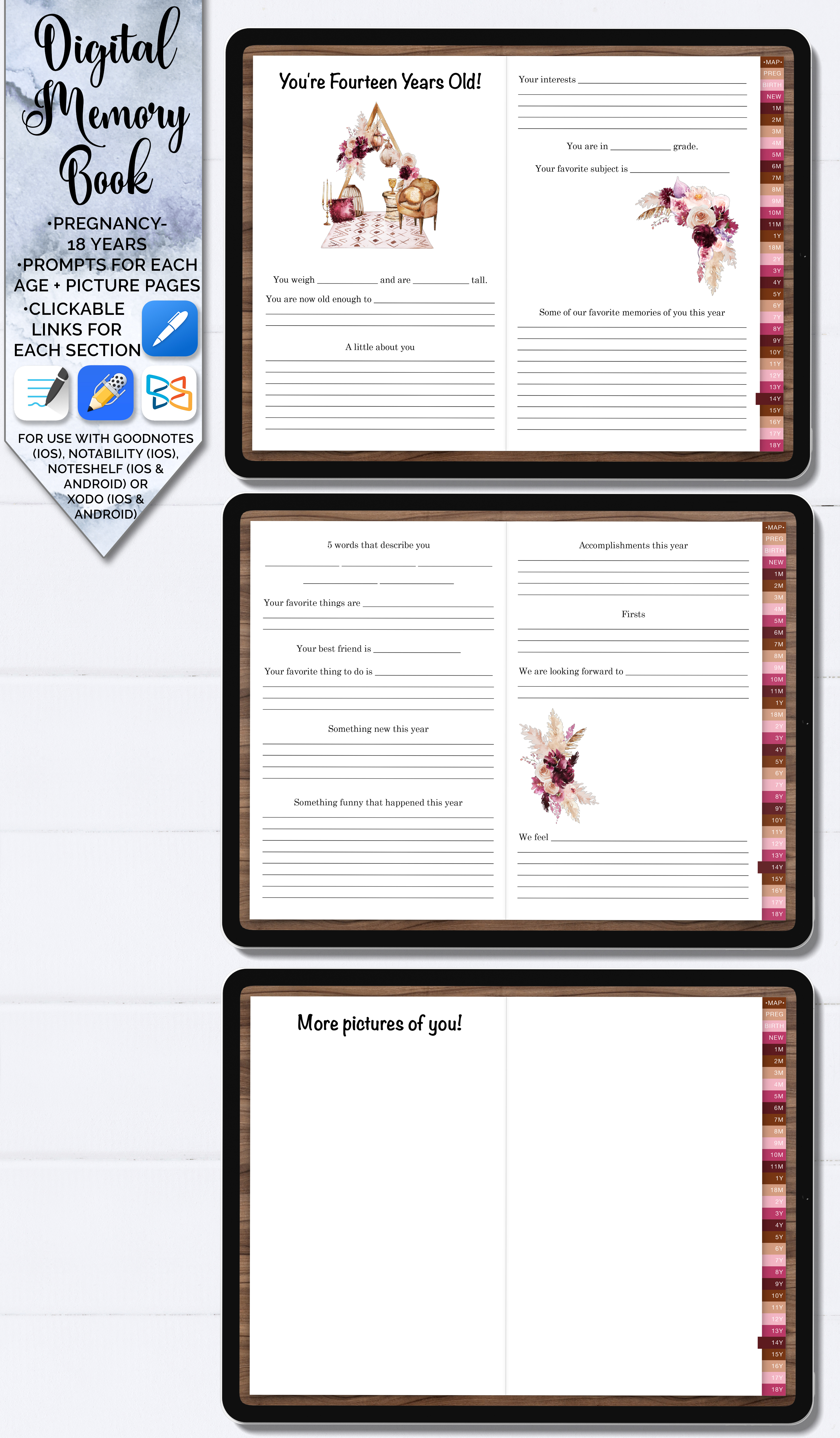 This is a 138 page hyperlinked PDF file ready for use in your note-taking app (see app compatibility down below). This memory book is fully hyperlinked featuring tabs on every page to access all milestones. There’s also an index featuring all of the milestones (also fully linked). There’s also blank pages for each section that can be found in the back of the book. With the blank pages, you can add your own prompts, etc throughout the book.