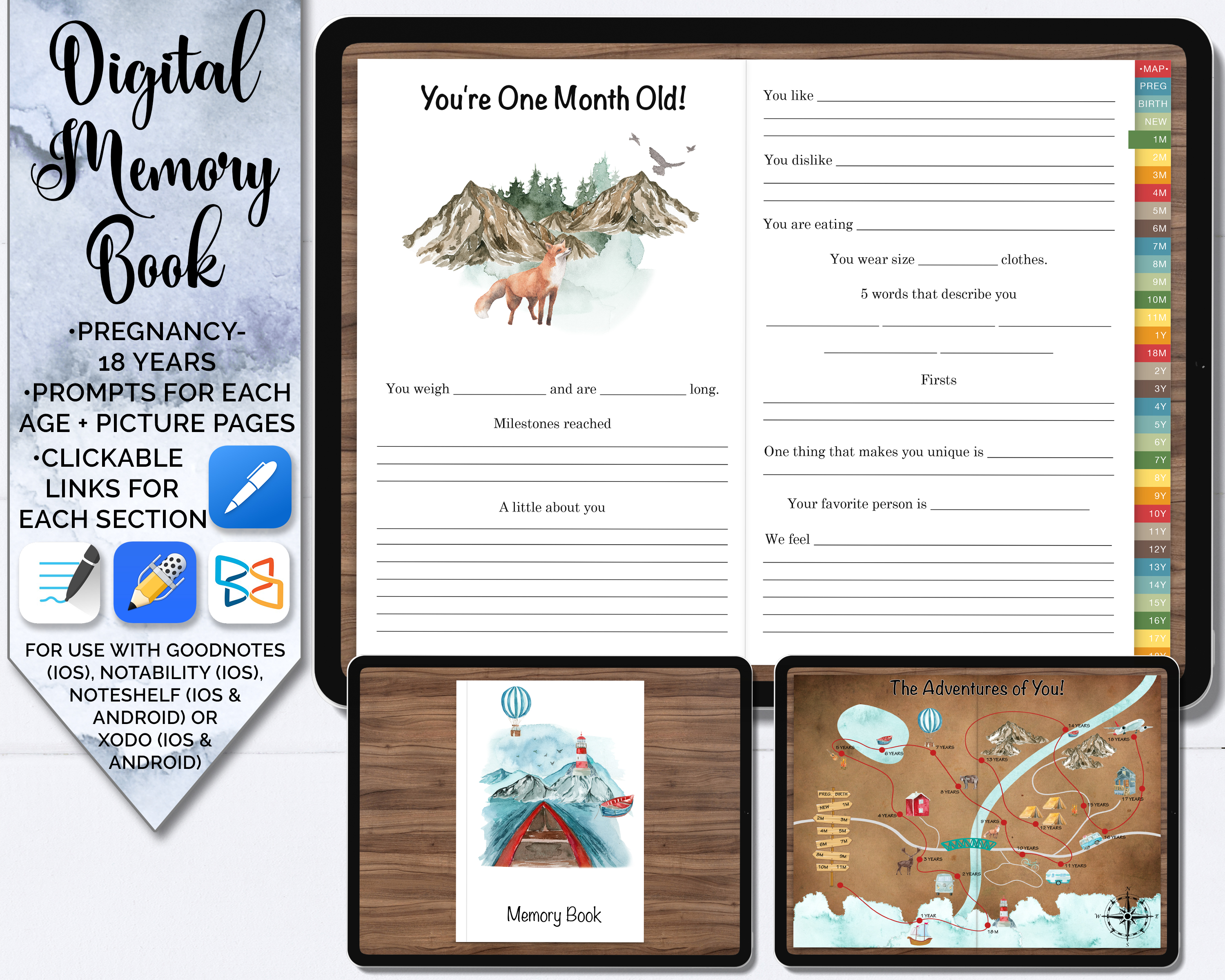 This is a 138 page hyperlinked PDF file ready for use in your note-taking app (see app compatibility down below). This memory book is fully hyperlinked featuring tabs on every page to access all milestones. There’s also a map featuring all of the milestones (also fully linked). There’s also blank pages for each section that can be found in the back of the book. With the blank pages, you can add your own prompts, etc throughout the book.