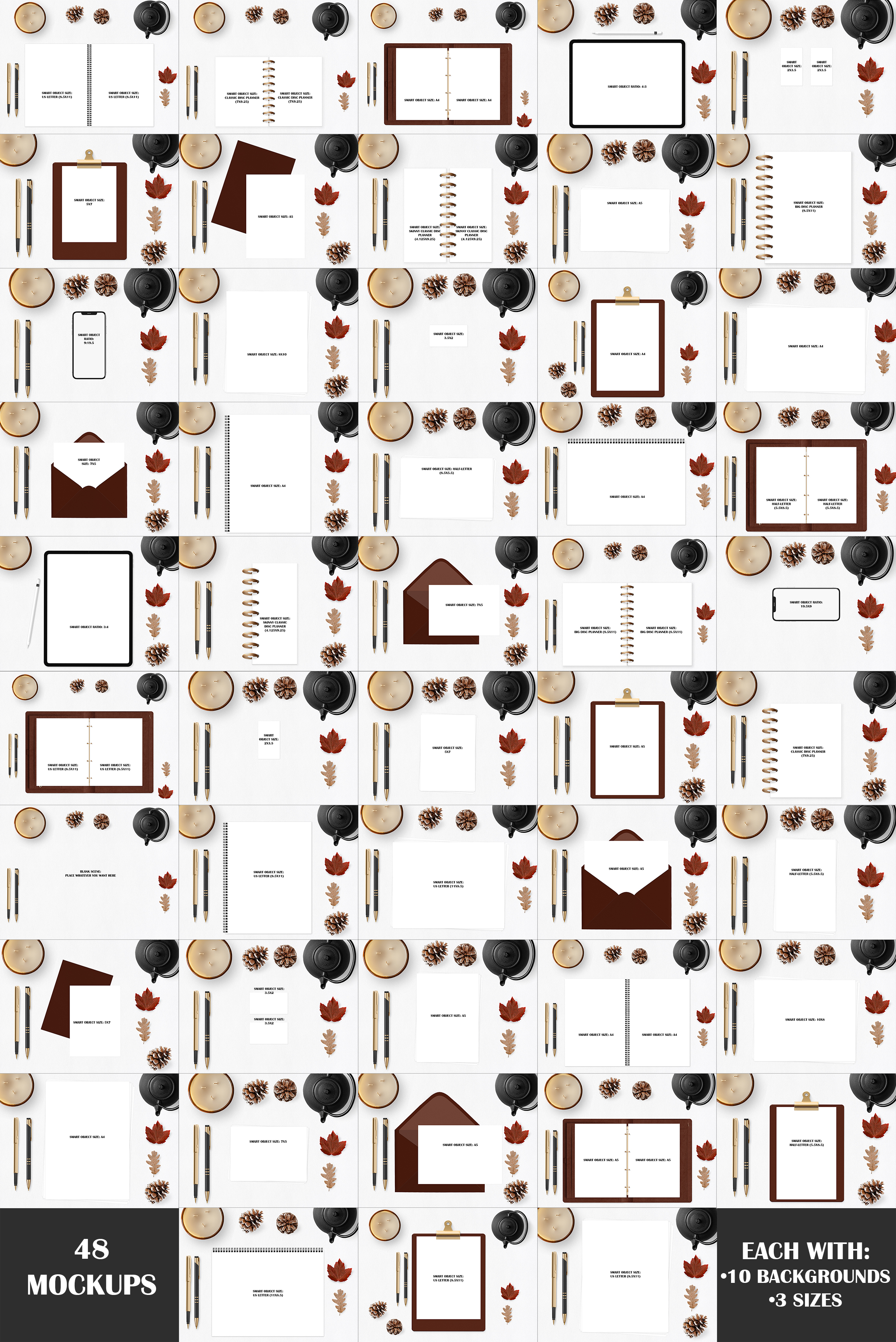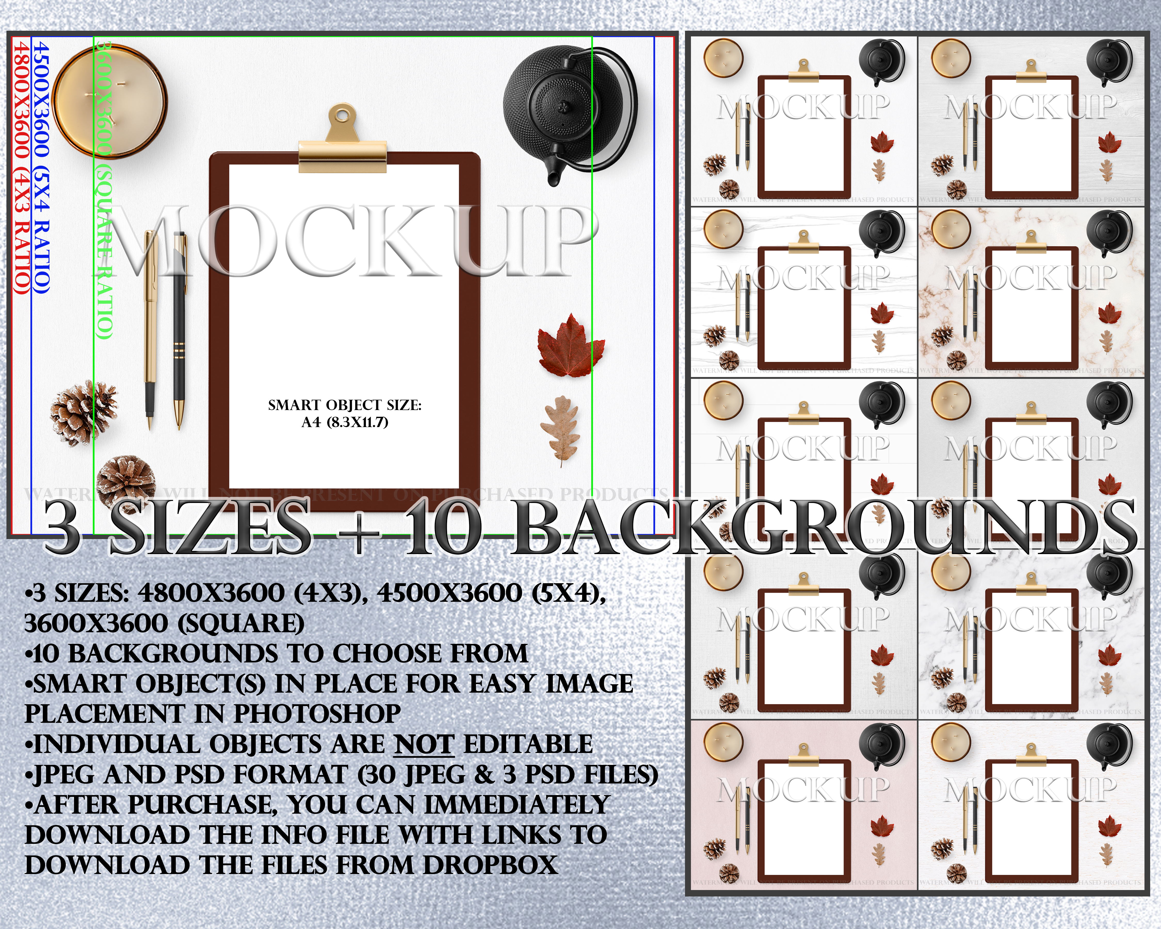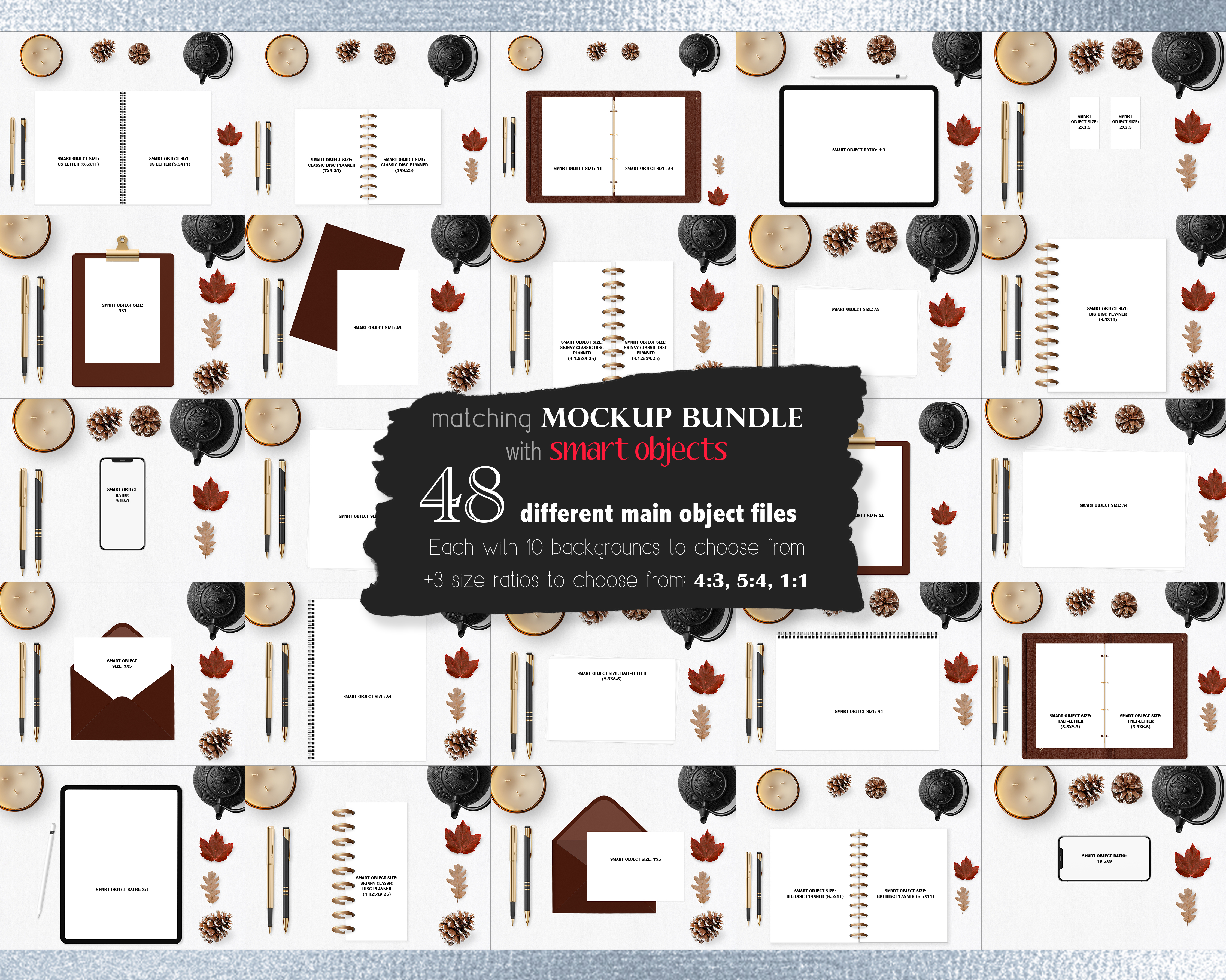 The 48 mockups included all feature the same theme of items to make them match and look cohesive for your different products. Below you’ll find a list of the 48 different mockup main objects in this mockup bundle– all of which feature smart objects to make your image placement easy if you’re using Photoshop. They all come in JPG format as well. There’s 10 backgrounds to select from (as seen in the pictures) for each mockup. There’s also three different size ratios to choose from: 4:3, 5:4, 1:1 to accommodate different websites.