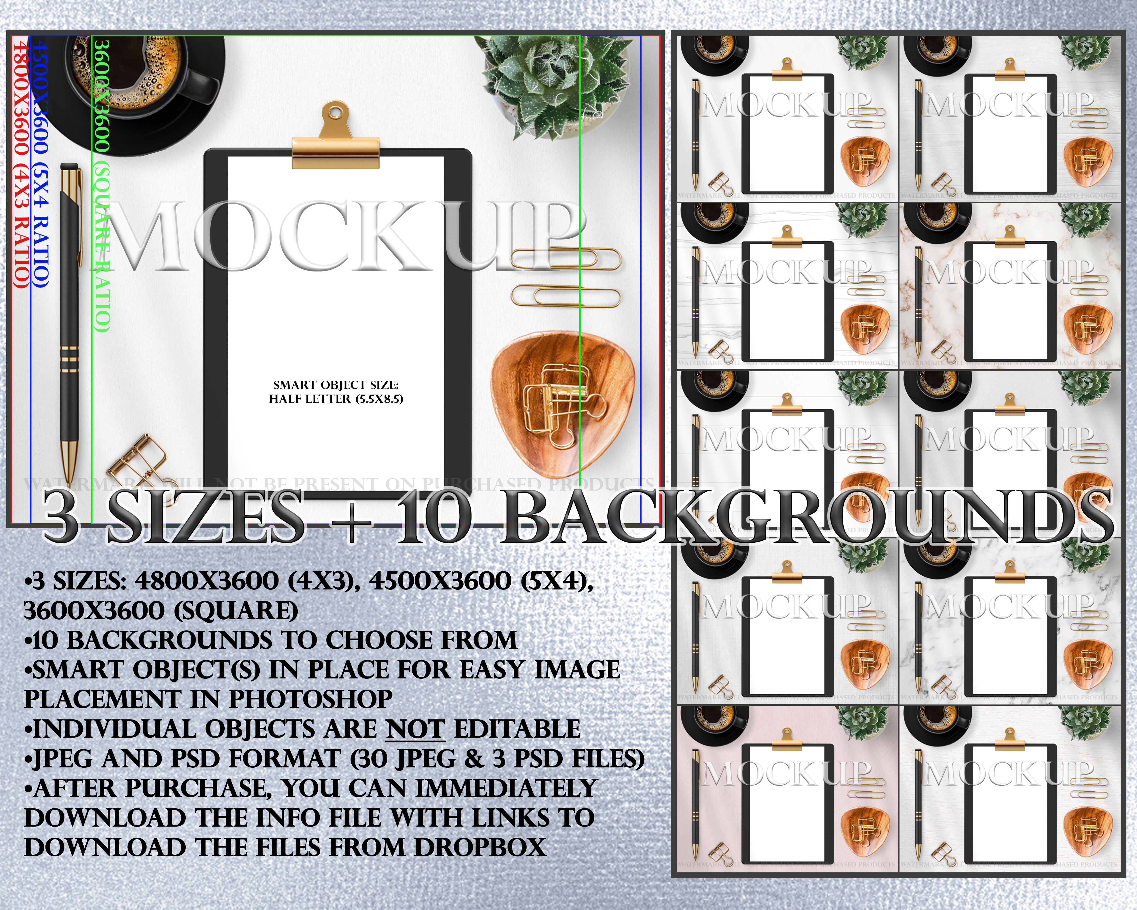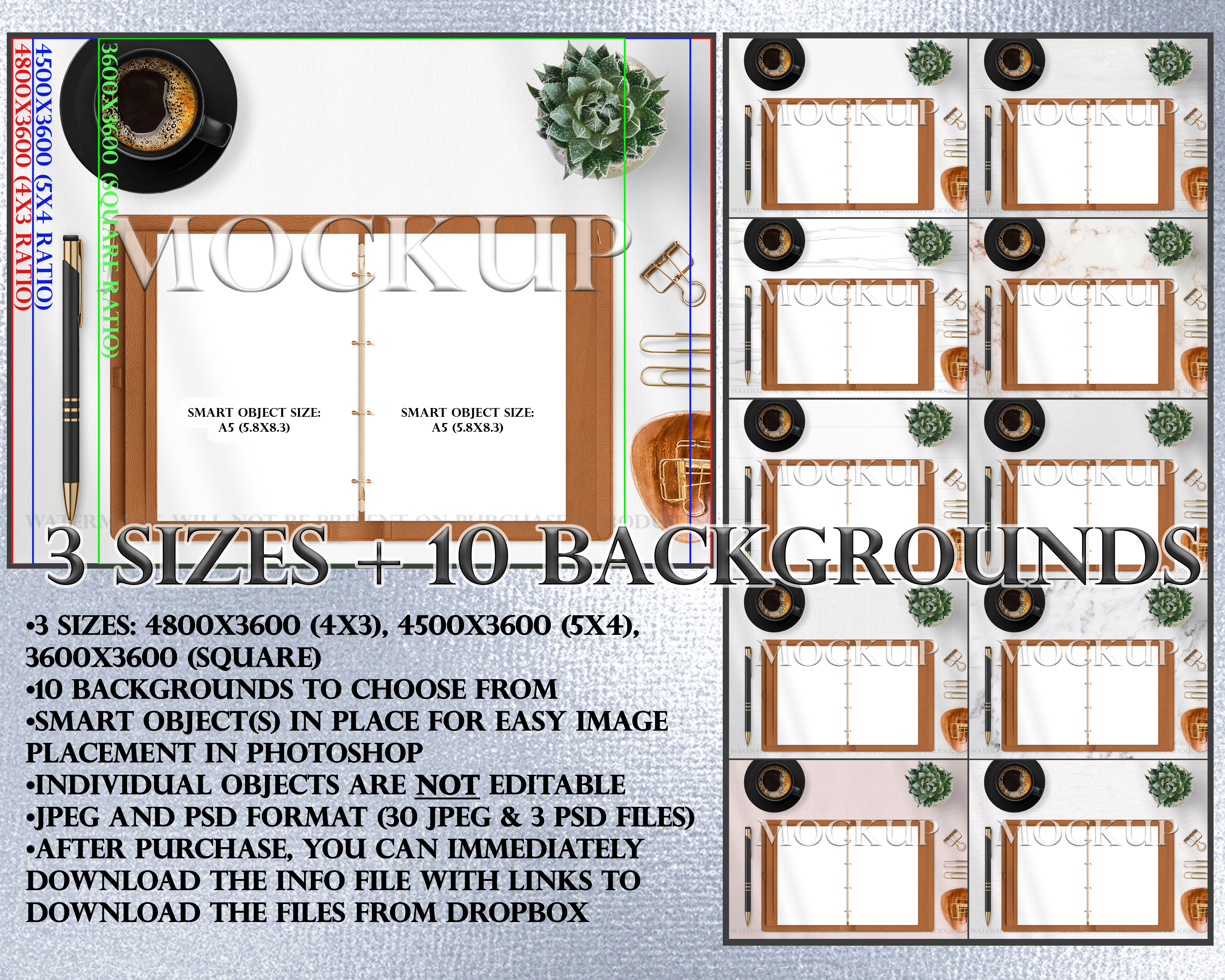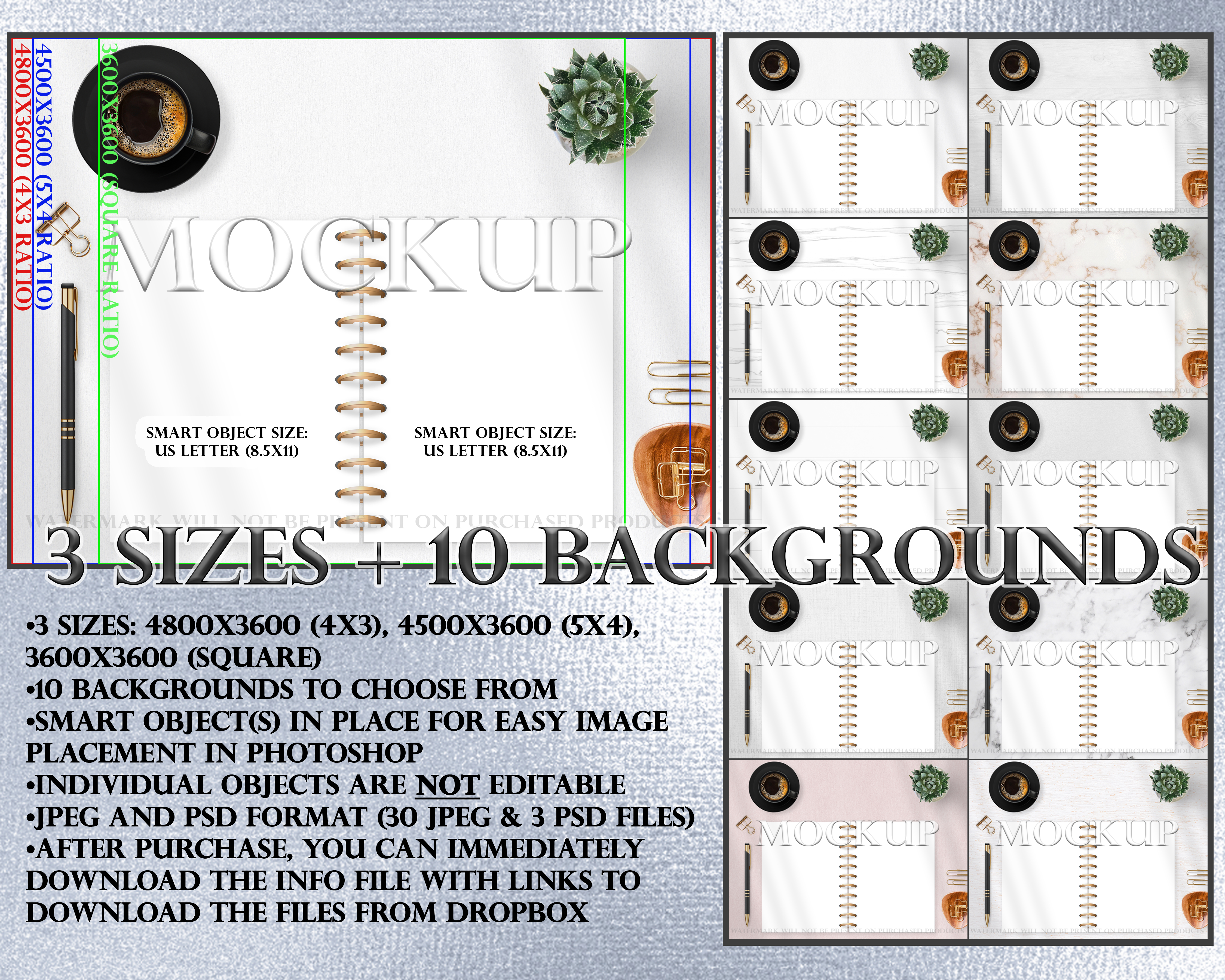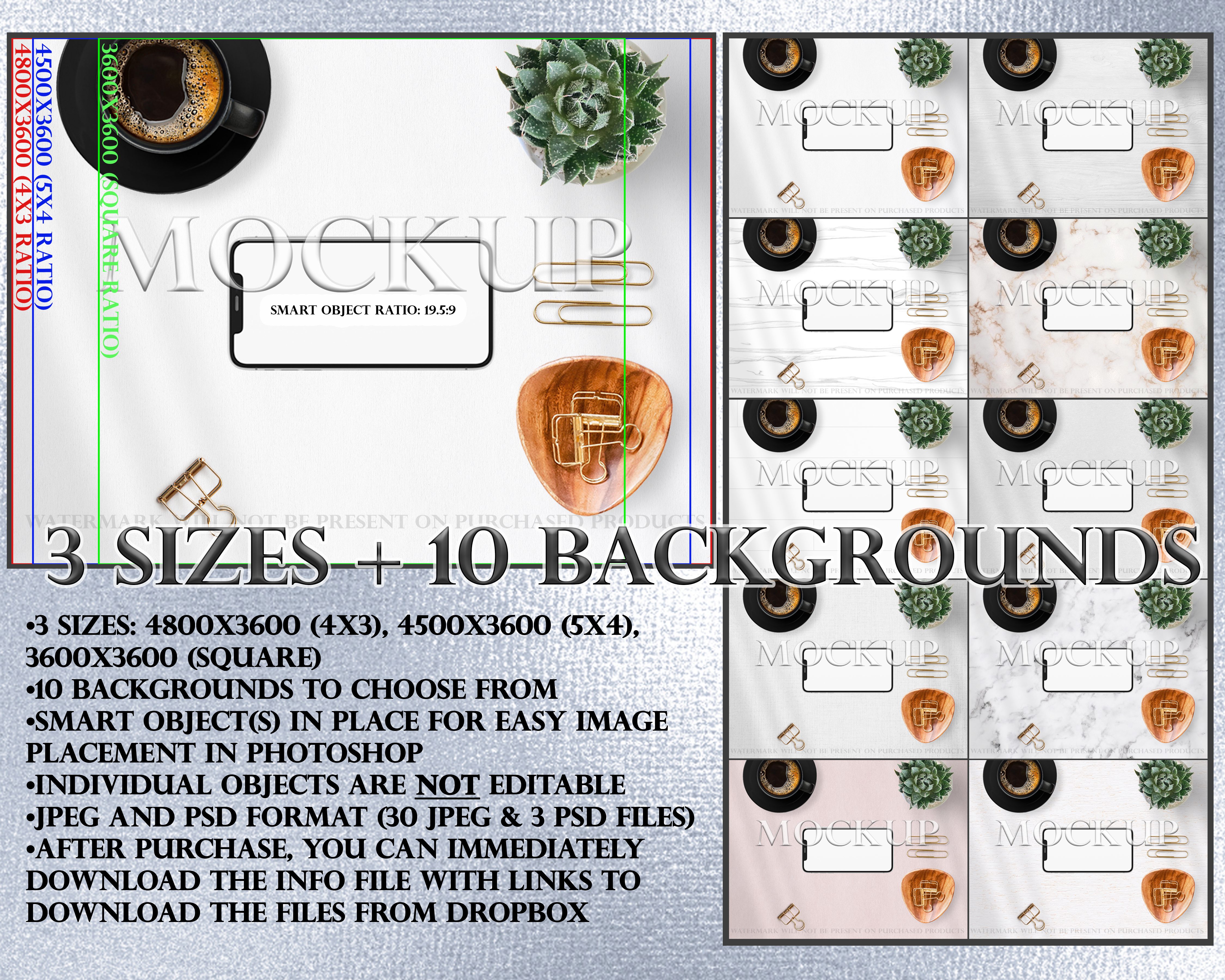 •3 Photoshop image files with smart objects for easy editing (1 for each size)