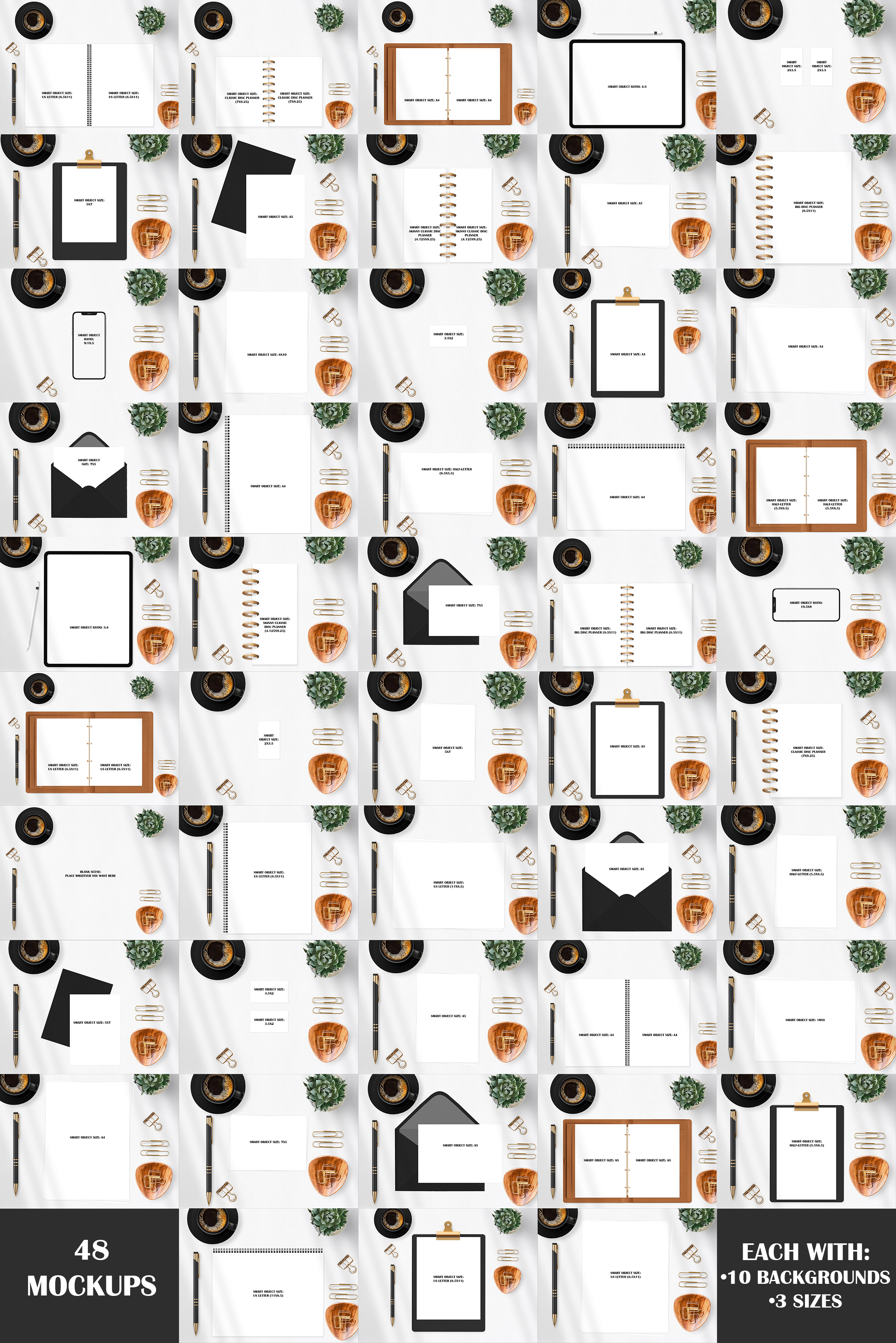 The 48 mockups included all feature the same theme of items to make them match and look cohesive for your different products. Below you’ll find a list of the 48 different mockup main objects in this mockup bundle– all of which feature smart objects to make your image placement easy if you’re using Photoshop. They all come in JPG format as well. There’s 10 backgrounds to select from (as seen in the pictures) for each mockup. There’s also three different size ratios to choose from: 4:3, 5:4, 1:1 to accommodate different websites.