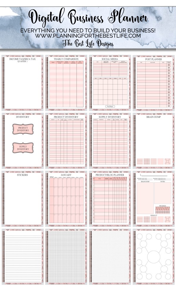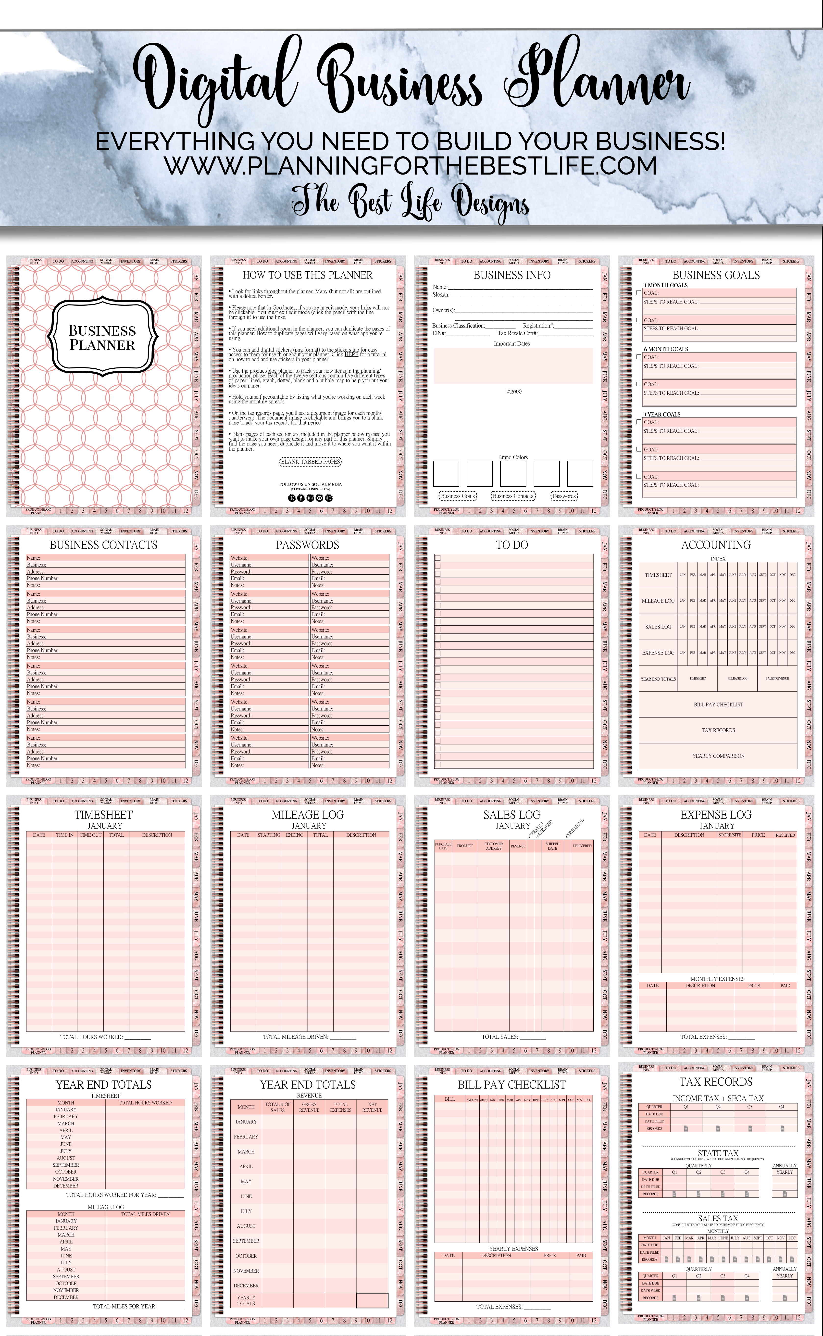 This pink digital business planner includes everything you need to grow your business! This is perfect for those who create digital products as well as physical products and blogs. It includes many accounting pages as well as planner pages with five different types of paper to plan with: lined, graph, dotted, blank and bubble maps. Check out the photos to see a complete view of all the pages.