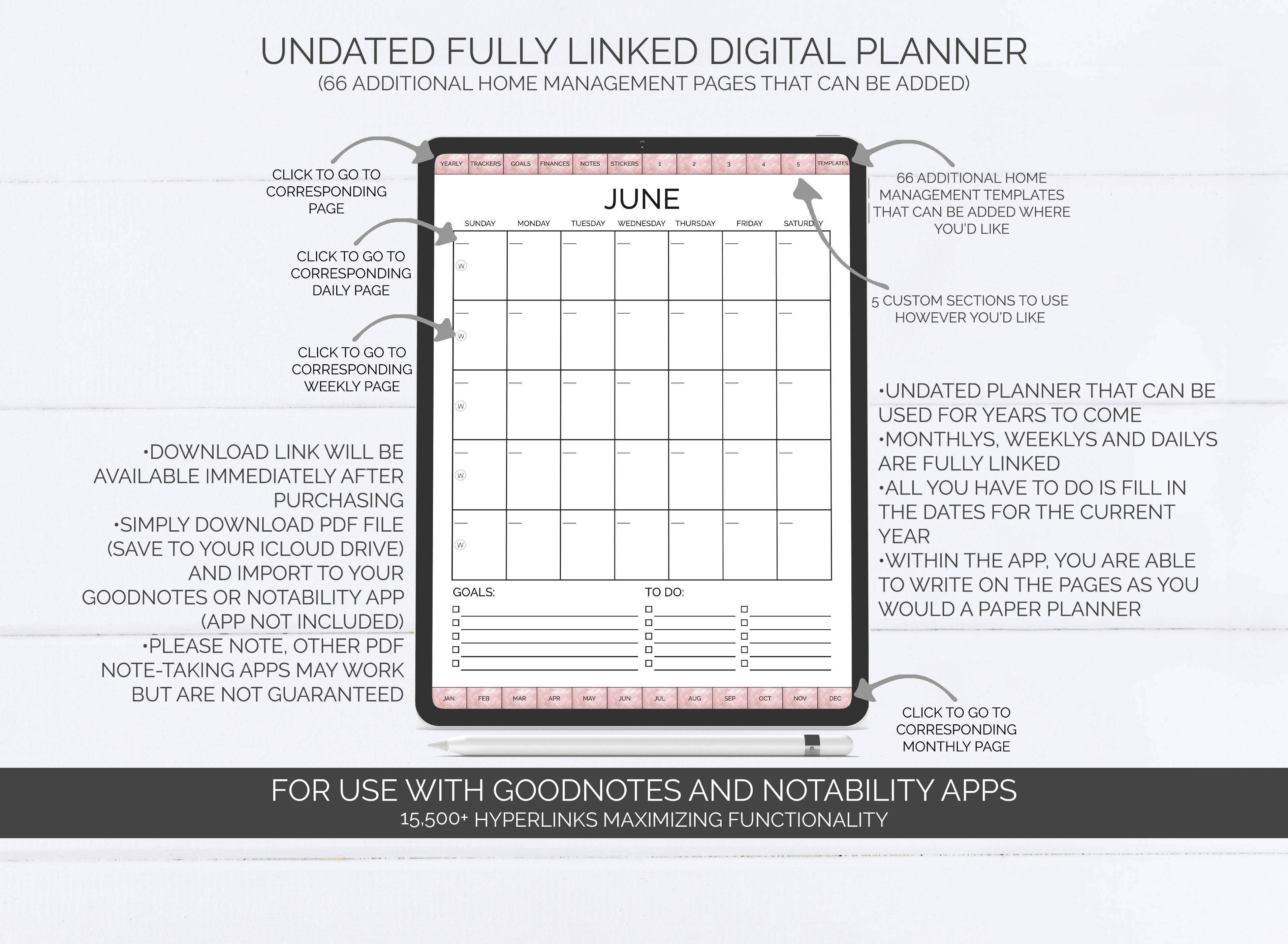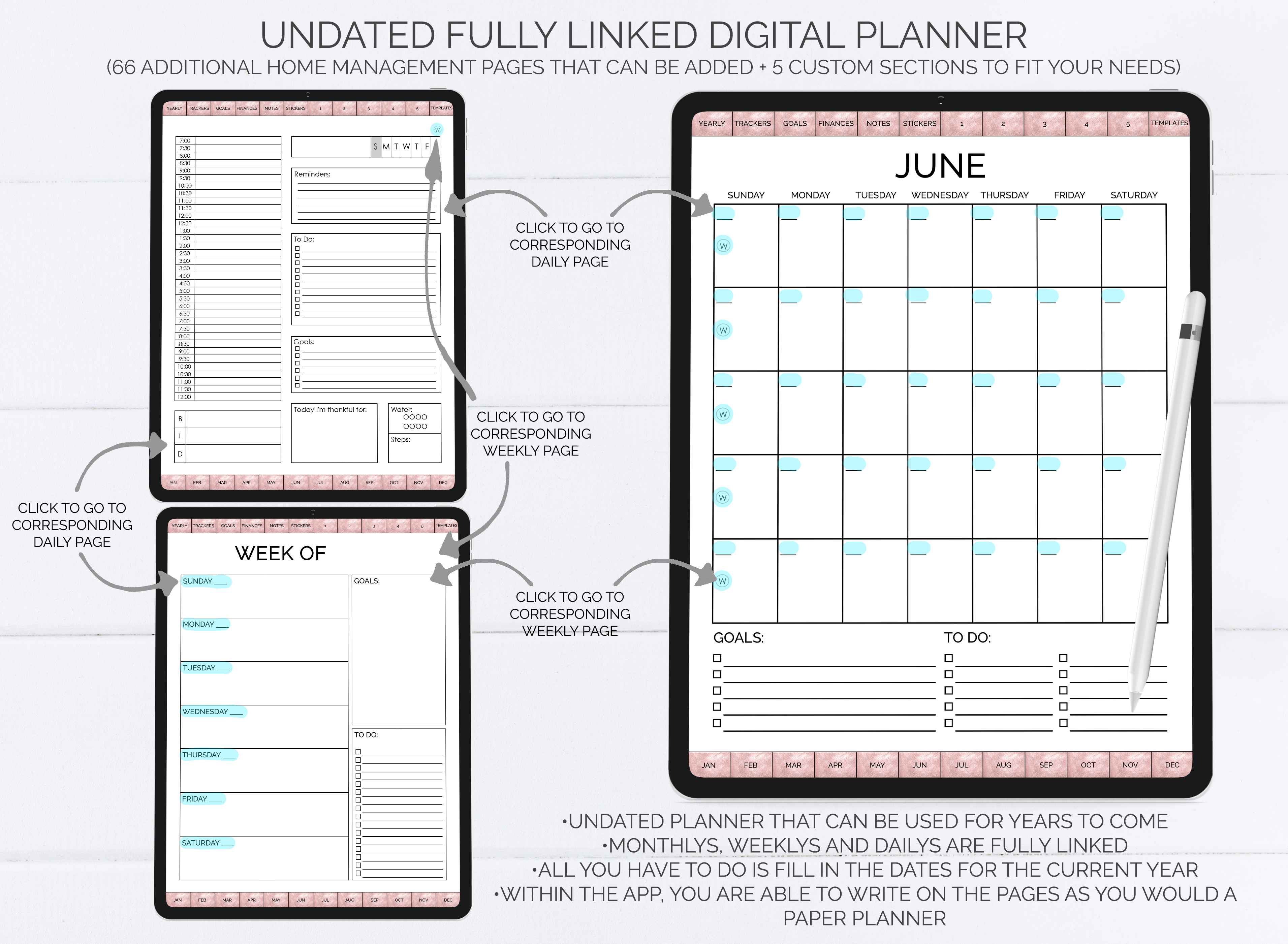 This pink undated digital planner is exactly what you’ve been looking for! It has UNDATED monthly, weekly and daily pages. This planner can be used year after year. Over 15,500+ hyperlinks making this planner very functional and easy to navigate.